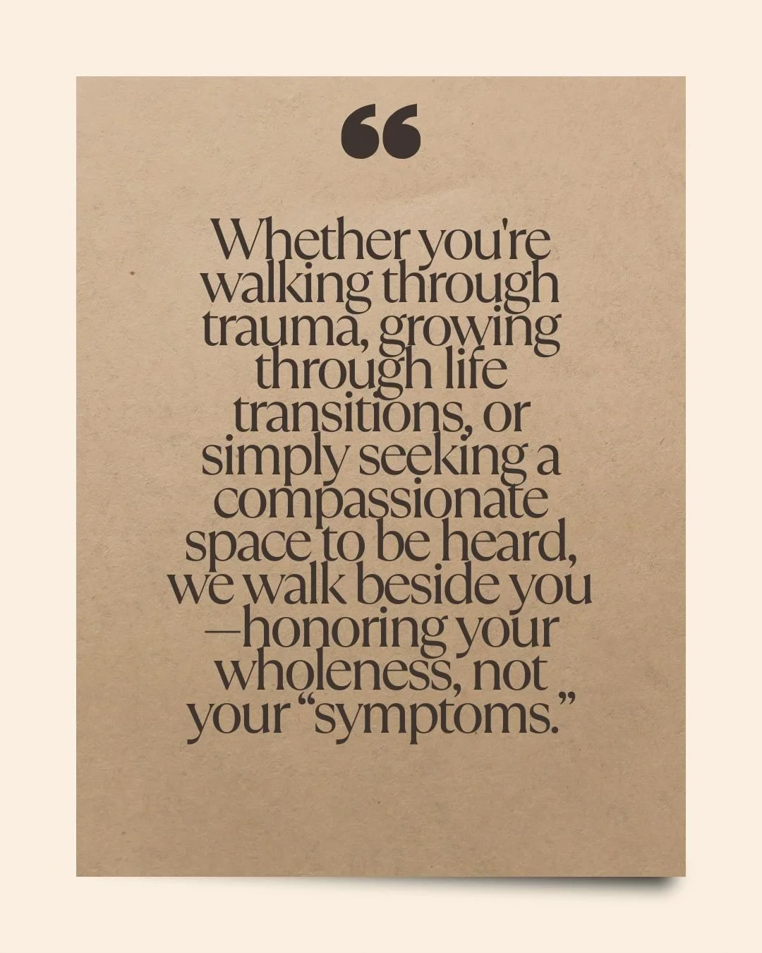 Whether you’re navigating trauma, seeking personal growth, or simply in need of a compassionate ear, our goal is to walk alongside you as you embark on a journey of healing and self-discovery.